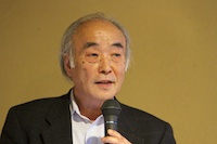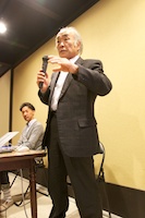 ついで、洛中洛外から歴史家の森谷尅久さんの「京のこやし咄」と題するお話がありました。京の中心部のし尿を肥桶に入れて農村へと運搬して資源活用し、逆に農村からは野菜が供給されるなど、中世の京都と周辺地域との間で権利関係とともに確立していた、し尿を基軸とする循環システムについて貴重なお話をうかがいました。