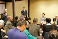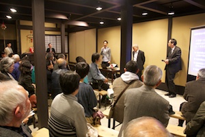 第22回嶋臺塾は、2011年度2回目ということで、「食」がテーマとなりました。学堂の谷さんからは、食と腸内細菌との関係についてお話しいただきました。人間のお腹の中には、300~500種類の腸内細菌がいて、その数は、宿主である人の細胞数よりもたくさんなのだそうです。どんな腸内細菌が棲みつくかは、何を食べているかで決まるのだそうですが、これは人の生体防御や消化機能と深く関わっているので、お腹の中から食べるものを考えることも大切だというお話でした。洛中・南禅寺門前からは、とうふ家の上田さんから、とうふの歴史とこれからのとうふについてお話いただきました(「とうふ家(toufu-ka)」は、上田さんが考えた、とうふの可能性に挑むひとの意をこめての呼称)。中国で生まれて、遣唐使によって日本に伝えられたとうふは、京都のお公家さんや寺社の厳しい要望に応えながら、江戸時代には、その製造技術が究極にまで洗練されたのだそうです。しかし、一時は全国5万軒に達したとうふ屋さんの数も、現在は1万軒にまで減少してしまいました。これからの日本の食の中で、どのようにとうふが生き残っていくかについての柔軟な発想と実践の必要性について、とうふ家のお立場からのご自身の取り組みも交えての、熱い思いをお聞かせいただきました。お二人の対談では、「とうふがお腹によいことは、長年食べてきた日本の誰もが知っているが、そのことについて、現代科学はどのような言葉で語っているのか?」との上田さんの問いに、それこそ現在進行中の大切な研究テーマであるとの答え。結果が期待されます。何を食べてきたかでお腹の中が決まり、お腹の中しだいで何を食べるべきかが決まる、ということで、食を、機能性からだけでなく、文化として考えることがのぞましいということを再確認し、とうふと日本人の関係を改めて考えさせられました。会場からも、自分の腸内細菌を心配した質問や、とうふについての素朴な疑問など、多数の質問が出て、和やかで活気のある集いとなりました。(吉野章)